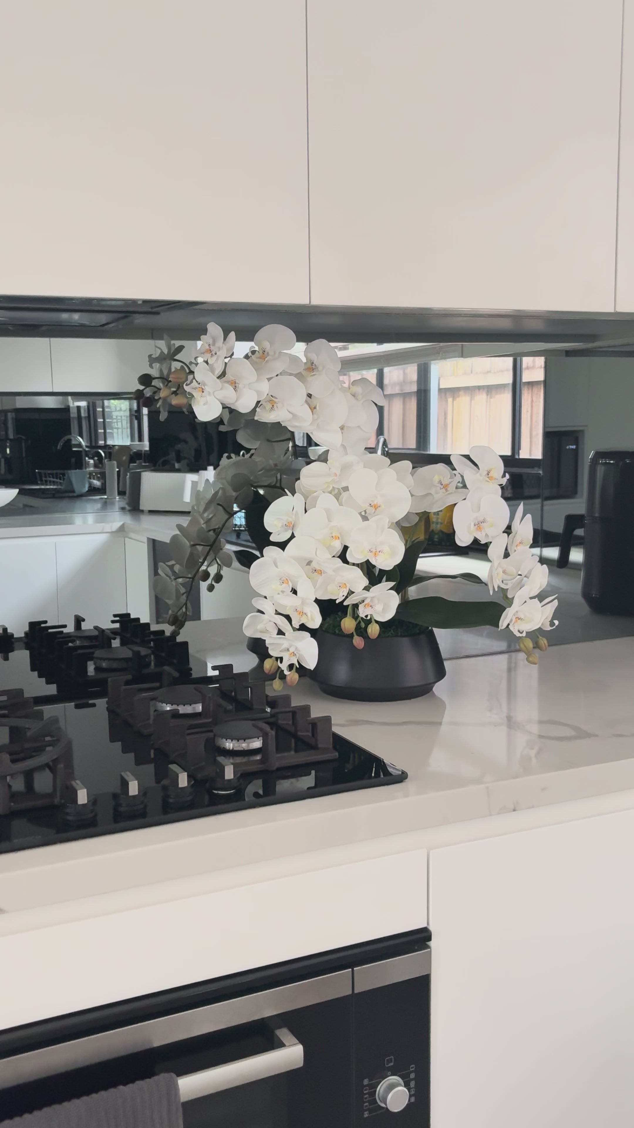 Transform any room with this striking white orchid arrangement set in a deep black vase. This arrangement arrives fully styled, with every stem positioned for balance and fullness. The petals have a soft, lifelike texture that photographs beautifully and stays perfect all year without water, sunlight, or maintenance. Ideal for console tables, bedside styling, kitchen counters, or entryways where you want a feature piece that stands out effortlessly.