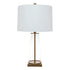 With a body made of a clear glass, the Giorgio Table Lamp draws inspiration from the works of traditional artisan designers. The lamp's transparency is accented by a painted antique gold rod through the glass and matching plinth. It is topped with an off white tapered linen shade.