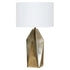 Elevate your design with this captivating contemporary masterpiece. Crafted with precision, its iron base in a brass finish complements diverse settings effortlessly. Complemented by a faux white linen drum shade, this geometric multi-faceted lamp exudes modern allure. Available in a brass or antique black finish.