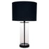 The Lorella Table lamp is a modern glass table lamp and would be a sleek addition to any space. Features a black metal rod encased in a clear glass cylinder base trimmed with matching black metal. Topped with a black linen drum shade.