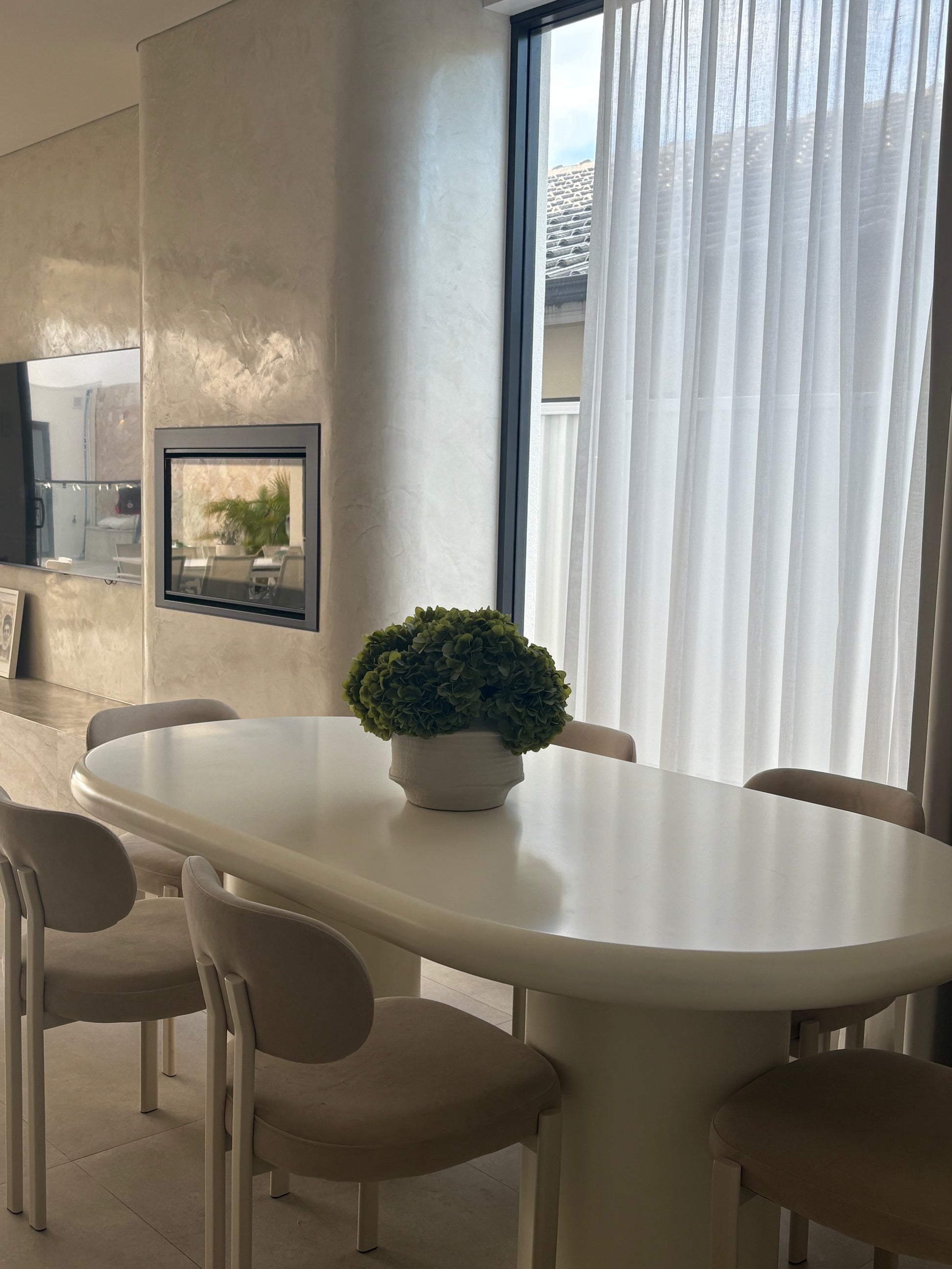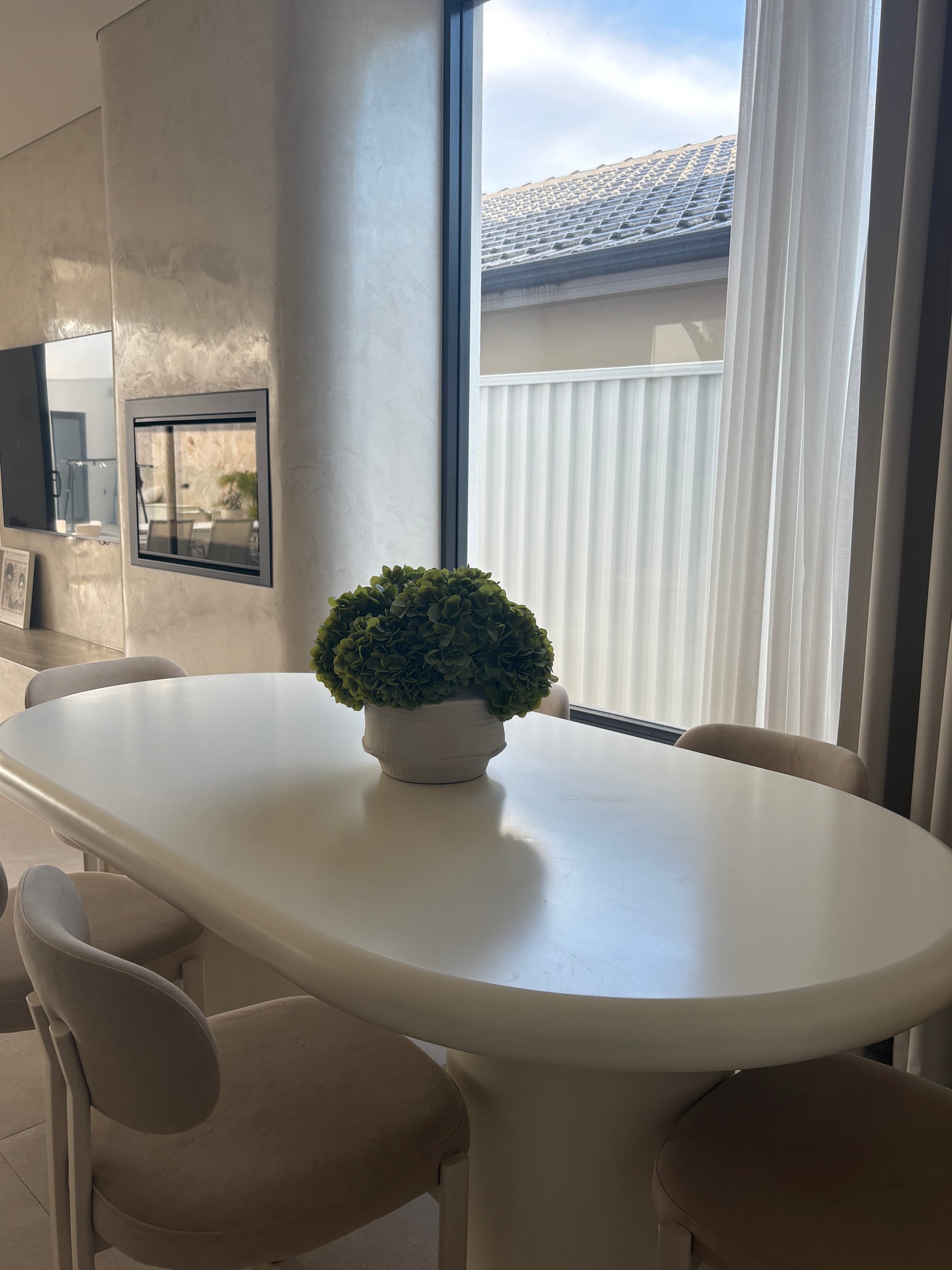 A lush cluster of real-touch green hydrangeas set in a textured ceramic pot. This full and timeless arrangement brings a fresh pop of green to any interior space — from dining tables to consoles. Each bloom is crafted for realism, offering the beauty of hydrangeas without the upkeep. A versatile piece that adds natural charm all year round.